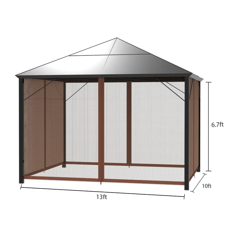 · Gazebo net dimensions: 13′ x 10′, with zipper in the middle. The gazebo replacement netting can fit most 13′ x 10′ gazebos. Before placing an order, please confirm the model number of the gazebo.